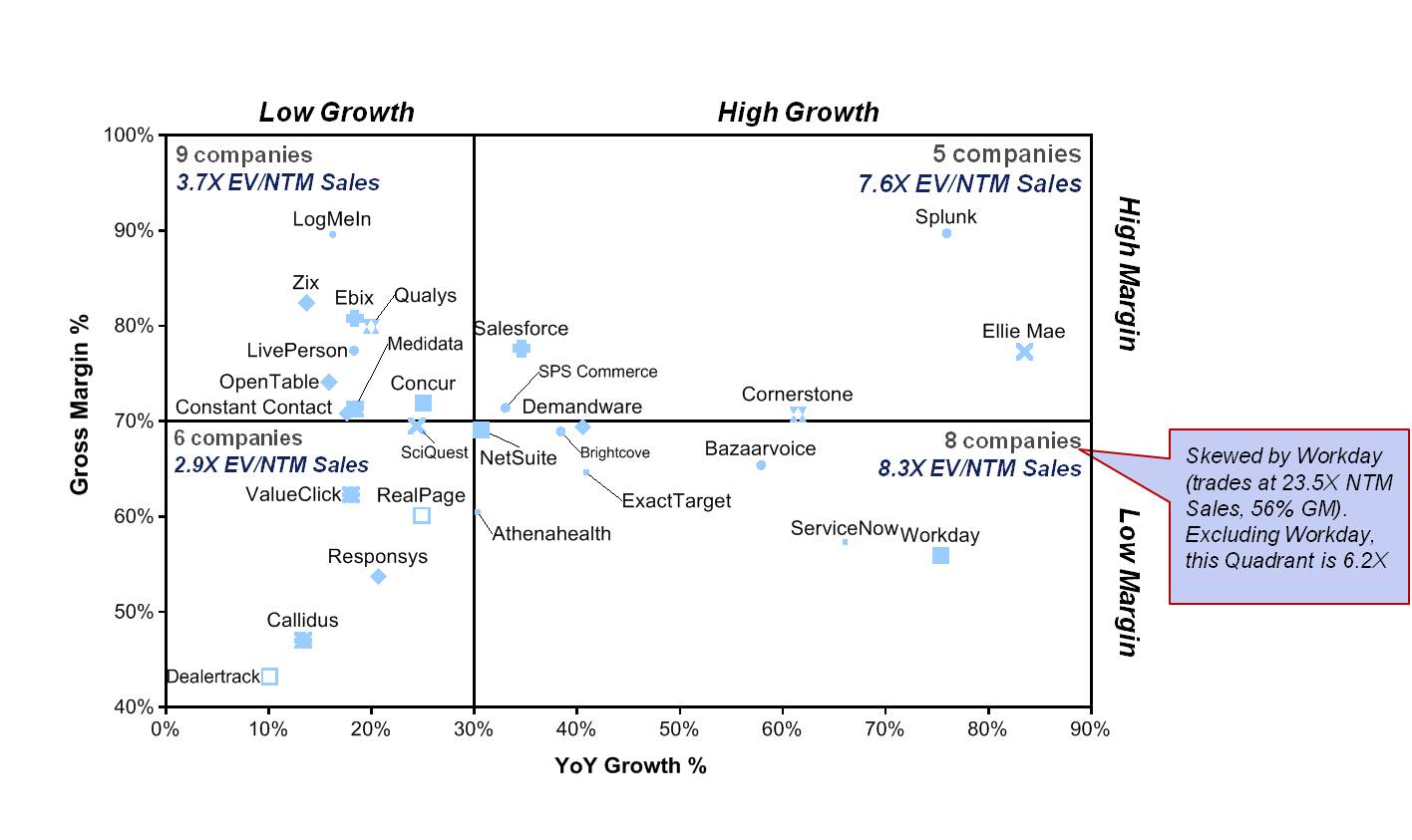 In short, looking across all public SaaS Co’s, high growth (>30% YoY), high gross margin (>70%) companies trade at 7.6X Enterprise Value / Next Twelve Months (EV/NTM) Sales, vs. industry wide average of 5.5X.